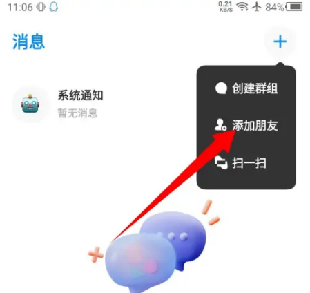 2、在弹出的选项中,点击添加朋友选项。