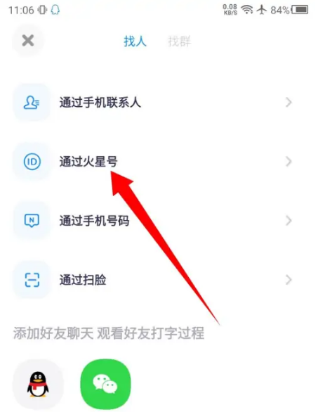 3、在打开的找人页面,点击通过火星号选项。