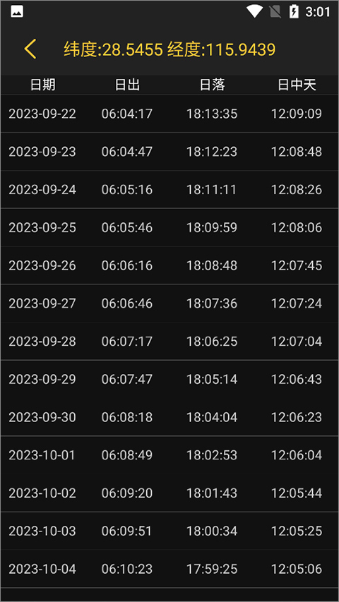 4、想做个长期规划?点击主界面右上角的记事本图标(可以参考第一张图右上角最右边的那个图标),未来差不多一整年的日出日落数据都能提前看,安排旅行或者摄影计划简直太方便了。