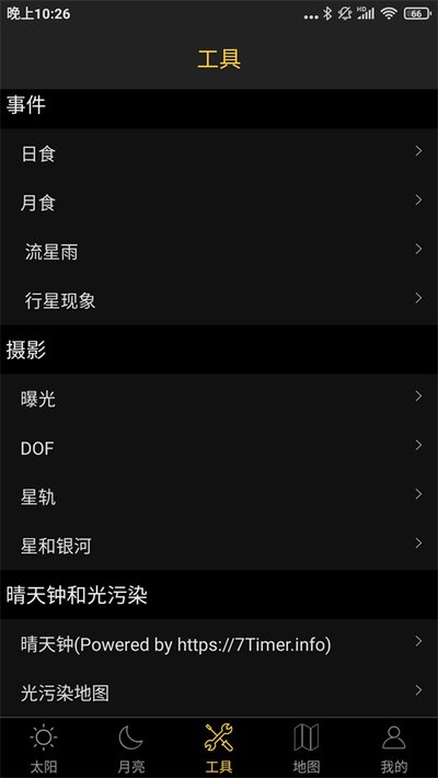 * 超多实用工具,不仅有日食、月食、流星雨的事件预报,还有曝光、景深、星轨等一堆摄影计算器,更有晴天钟和光污染地图帮你判断观测条件。