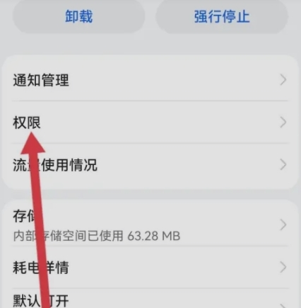 这时手机系统会跳到应用的设置页面,在这里找到【权限】管理的选项,点进去。