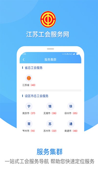 4、服务集群是把江苏所有的市各自设立了一个工会,用户可以选择自己所在的市级工会办理服务;