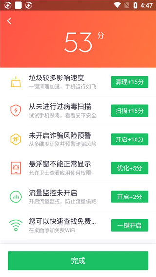 2、接着,软件会快速评估你手机的当前状况,并给出一个安全分数。如果分数不高,颜色会偏深,提示你存在风险,这时我们点击一下就可以开始修复。