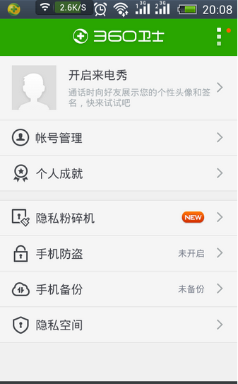 3. 接着,在隐私保护页面里,点击“手机备份”选项。如果你还没有360账号,这里会提示你注册一个,过程很简单。