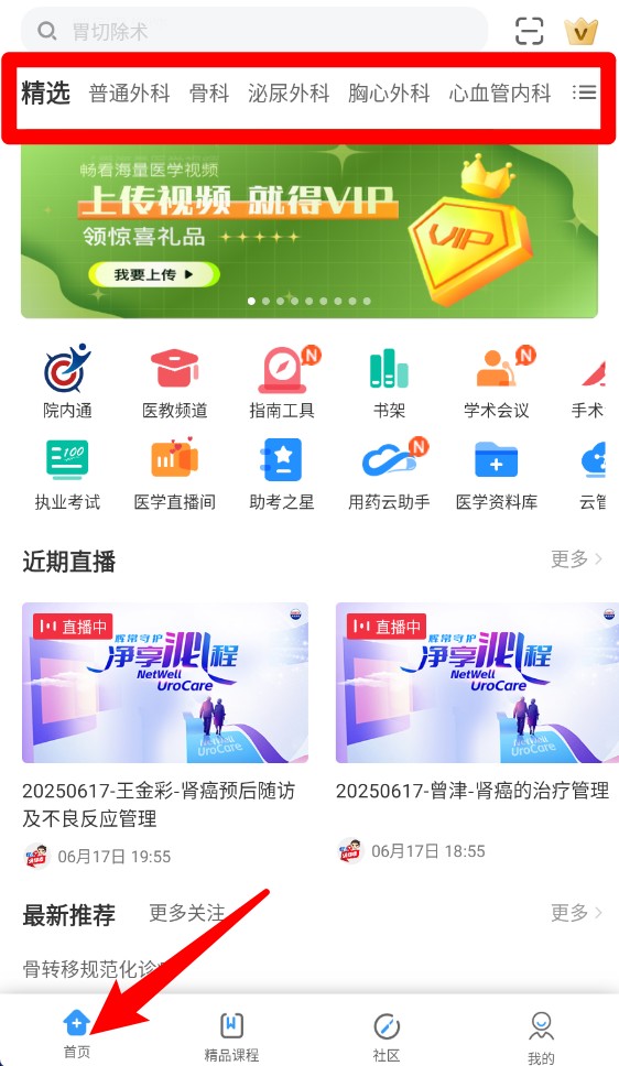 1.一打开app,首先看到的就是首页。这里的布局设计得特别直观,各种热门的医学视频和重要的科室分类入口都一目了然。你可以直接点击感兴趣的科室,比如心内科、骨科或者儿科,马上就能看到相关的学习内容。如果你的目标很明确,想找某个特定的知识点,顶部的搜索框就派上用场了,输入关键词就能快速定位。这种设计大大节省了寻找资料的时间,让学习变得更高效。
