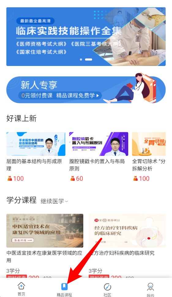 2.在“精品课程”这个专区里,藏着海量的宝藏教学资源。无论你是想系统学习某项临床操作技能,还是正在为马上要来的资格考试发愁,这里都有为你量身打造的课程。这些课程内容都经过精心编排,知识点讲解得非常透彻。更棒的是,为了欢迎新朋友的加入,app还特别准备了福利,第一次来的用户可以免费领取一些精选的学习内容,先体验一下,感受专业学习的魅力。
