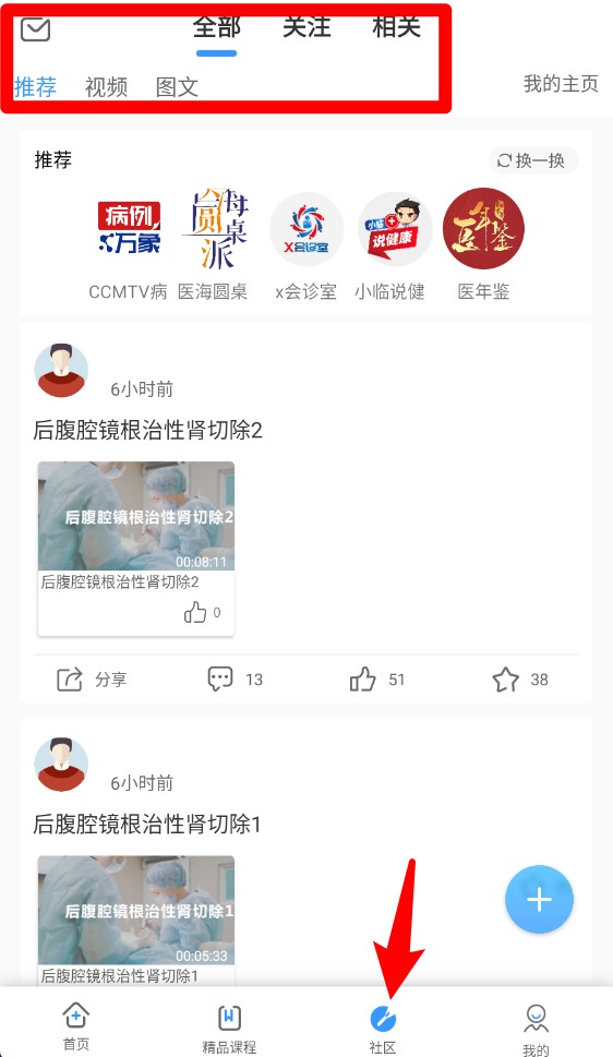 3.学习有时候是件挺孤独的事,但在这里你不会感到孤单。“社区”板块就像一个专属于医疗同行的朋友圈。大家可以在这里用视频或者图文的形式,分享自己遇到的典型病例、工作中的心得体会,或者提出一些临床上遇到的困惑。系统也会根据你的专业和兴趣,推荐你可能感兴趣的动态。你可以关注那些你欣赏的专家或同行,随时互动交流,互相启发,让知识在碰撞中产生火花。