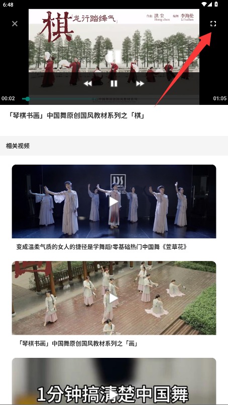 4、进入播放页面后,你会发现视频窗口的右上角有个放大图标,没错,就是那个全屏按钮。点一下它,手机屏幕瞬间就会变成你的专属舞蹈教室,高清大屏观看老师的每一个动作细节,学习体验直接拉满。