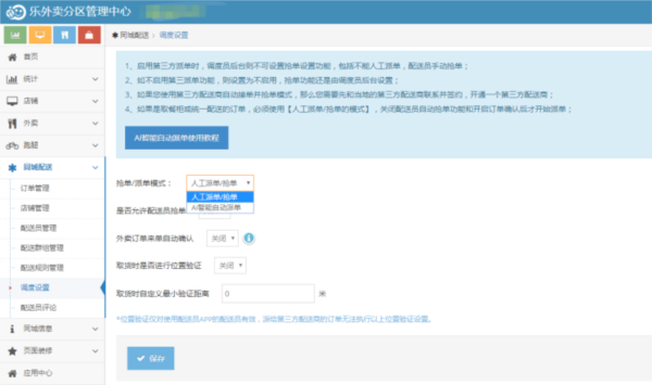 6. 后台还可以进行一些调度设置,比如可以选择是让配送员自由抢单,还是由调度员手动指派。还可以设置订单是否需要骑手确认后才算接单成功,以及取货距离的限制等。