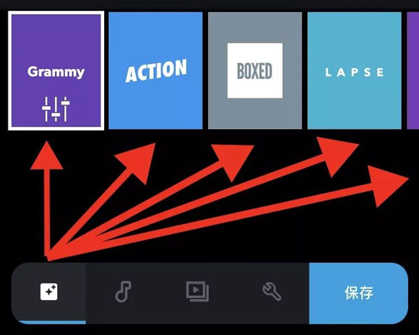 素材导进来之后,你就会看到编辑界面了。Quik内置了总共22个不同的模板,你可以根据自己的喜好,一个一个点开来试试效果。我个人比较常用的是Grammy、ACTION和BOXED这三个。Quik手机版的每个模板都自带转场特效,不过这些特效是不能手动添加的,软件会根据你选的音乐和片段里的声音来随机安排,而且也不是每个片段之间都会有转场,所以有点看缘分。但可以确定的是,如果两个素材片段都特别短,比如只有一两秒,那它们中间基本是不会出现特效的。Quik的设计理念就是不想用太多复杂的选项来为难用户。