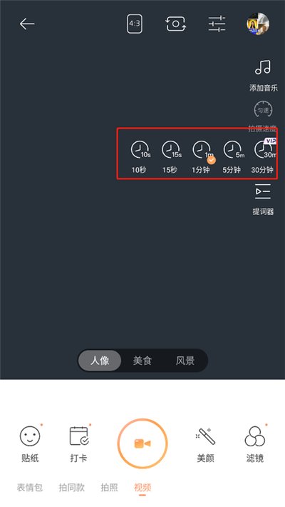 3、看屏幕右边,有一竖排小工具。找到那个写着“时长”的按钮,点开它,你就能选啦,从10秒短片到30分钟的长视频,想拍多久都行。