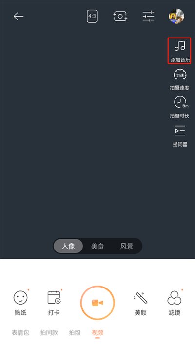 4、想给你的视频配上点背景音乐?很简单,还是在右边那排工具里,找到“添加音乐”的图标。