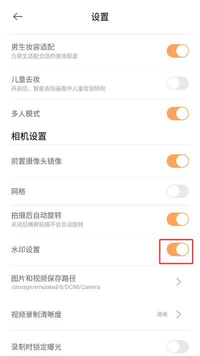 3、进入设置菜单后,往下滑一滑,就能找到“水印设置”这个开关了。只要把它关掉,之后拍出来的照片和视频就干干净净,没有那几个字啦。
