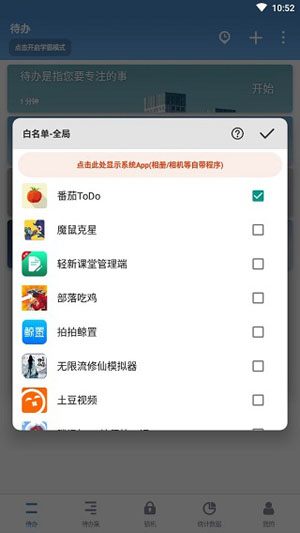 3、由于开启学霸模式之后,番茄钟就会禁止打开其他的软件,大家还可以通过“学霸模式白名单”功能勾选应用,避免误拦截的情况。