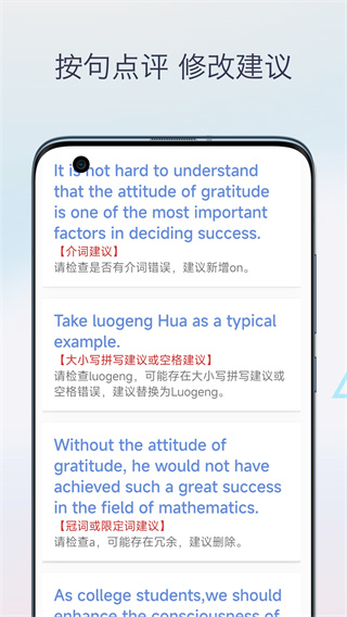 《英语作文批改》是一款对学生以及英语爱好者非常有用的智能写作辅助工具APP,采用了黑科技的人工智能技术,可以即时识别作文中的语法错误、拼写问题和表达不当之处,并提供非常精准的修改建议,让写作进步看得见。