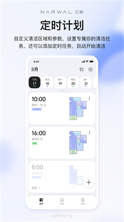 按生活规律设置定时清洁,上班离家自动清扫,归家即可享受整洁舒适的家居环境。