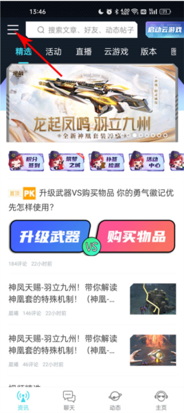 2、在资讯首页找到左上角的那个三条横杠的图标,点一下它;