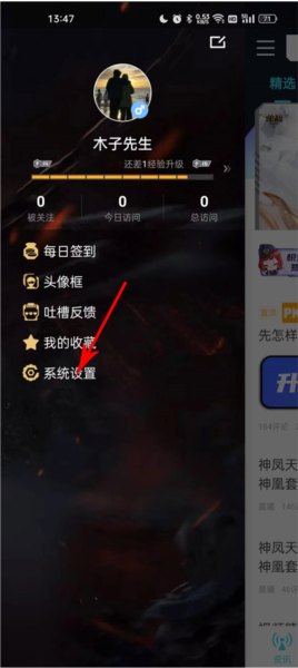 3、点开后会弹出一个菜单,里面有每日签到、头像框、吐槽反馈、我的收藏、系统设置这些选项,我们点“系统设置”;