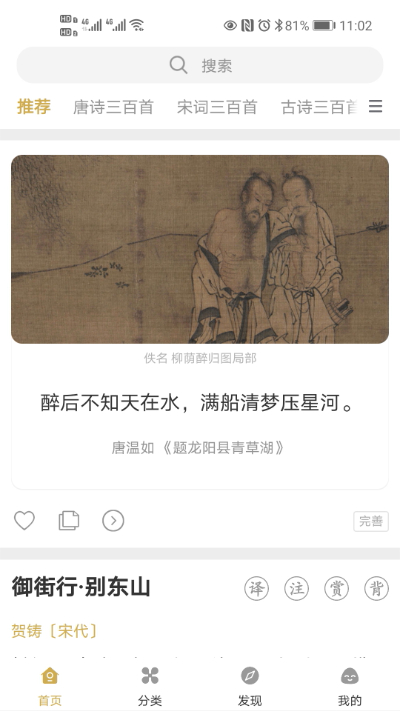 1、【分类】里面可以根据各个选项,分类筛选不同作者的诗句和诗文。