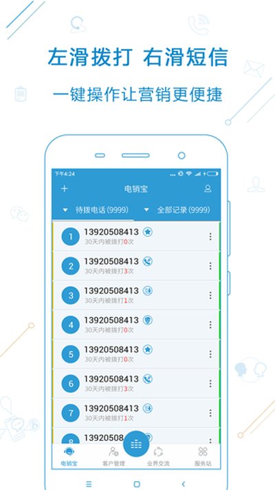 电销宝app是一款专门服务于电话销售人员的高效辅助软件。借助这款应用,用户可以运用智能导入联系方式、自动化拨号以及客户智能标记等一系列功能,显著优化自己的工作流程,从而有效增加接触到意向客户并最终达成交易的可能性。还能帮你系统化地管理客户资料,每一位客户的沟通细节都能被清晰记录,为后续的跟进与回访提供依据,确保你不会错过任何一个有价值的销售线索。