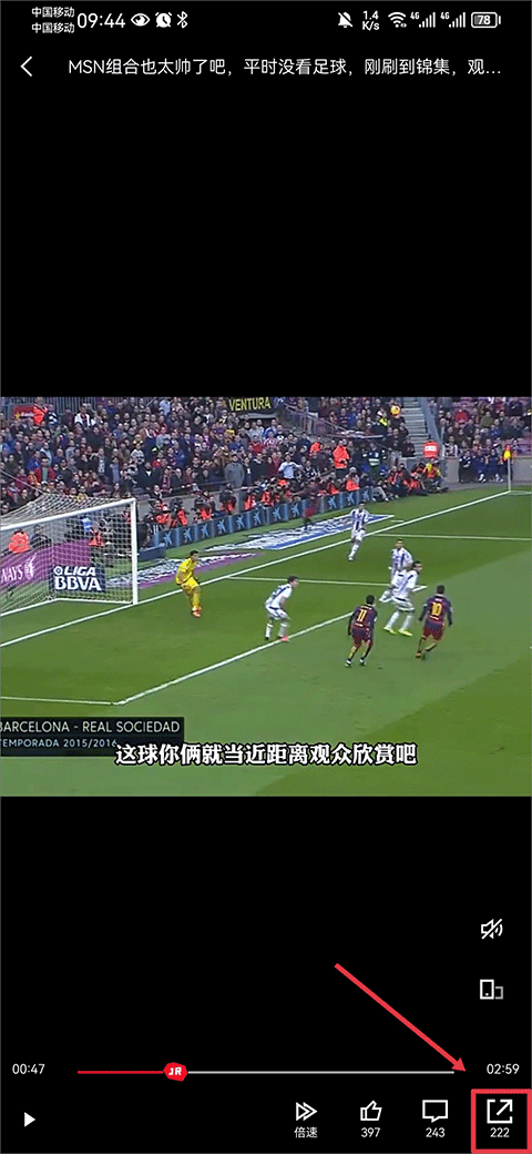 2、点开这个视频进入播放页面,然后留意一下界面右下角,会有一个分享样式的图标,点击它。