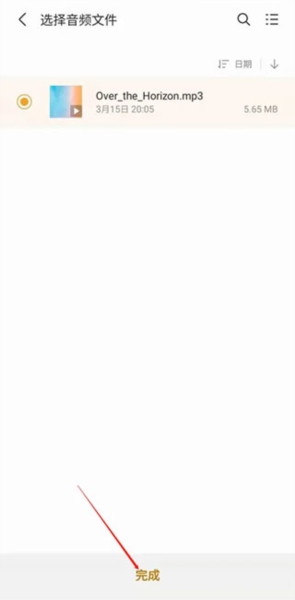 第四步,接下来应用会带你到手机的文件管理器里,让你选择想要插入的音频。找到你需要的那个音频文件,选中它,然后点击右下角的“完成”按钮。