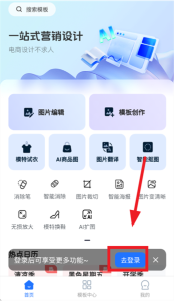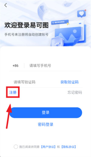 开始使用易可图非常简单。下载安装完成后,打开应用进入首页,点击去登录按钮。
