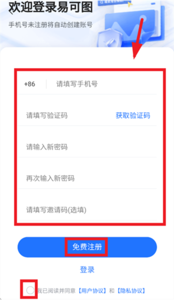 记得勾选用户协议和隐私协议,最后点击免费注册即可。
