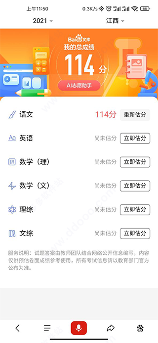 6、选择好地区后,就可以正式开始估分啦!选择你想要估分的科目,然后一题一题地对照着进行评估吧。