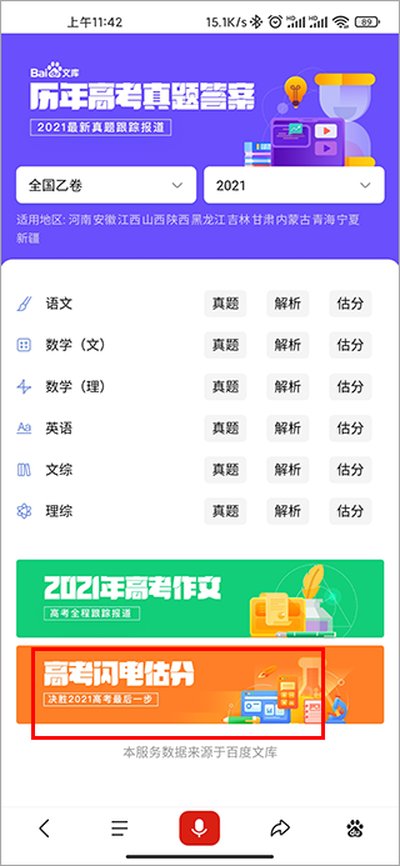 4、进入这个高考服务页面后,你会看到几个不同的功能选项,找到那个写着“闪电估分”的模块,点击它。
