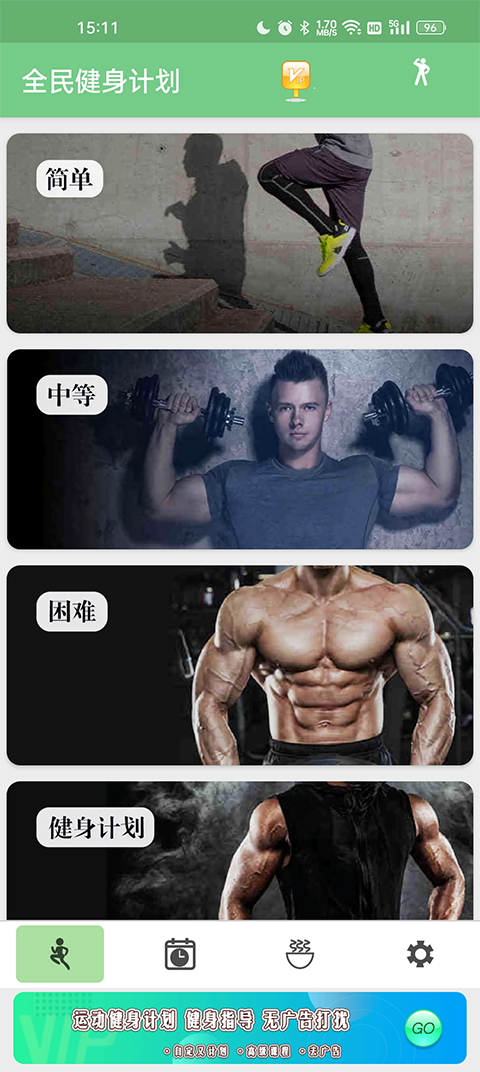 2、进入主界面后,你需要先根据自己的运动基础来挑选一个合适的健身计划。建议新手可以先从“简单”难度开始,如果感觉太轻松,再逐步挑战“中等”或“困难”级别。