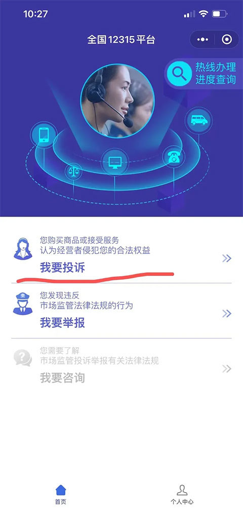 3、成功绑定后,系统会自动进入全国12315平台的主界面。此时,请再次点击右下角的“个人中心”图标。