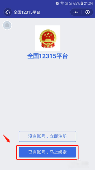 2、在跳转的页面中,准确输入你已经注册好的全国12315平台账号信息,然后点击下方的“立即绑定”按钮。