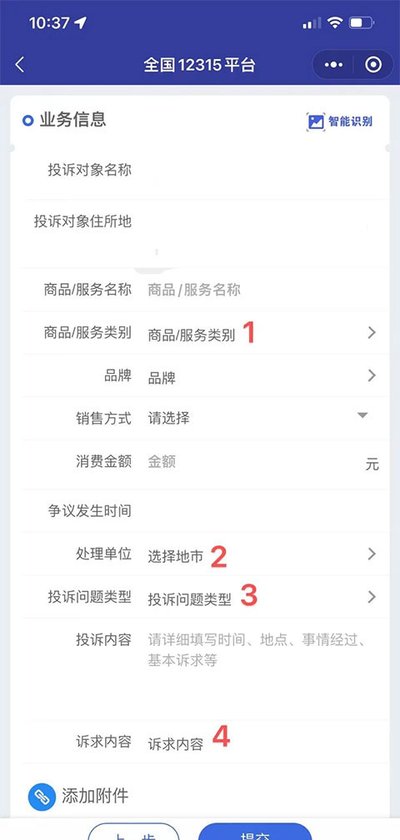 第五步:现在需要填写具体的业务信息。这部分内容会比较详细,主要包括你投诉对象的所在地、所购买的商品或接受服务的具体名称、交易方式以及消费金额等。请根据你的实际情况,逐项认真填写。页面上特别标注了四个需要你格外留意的项目,请务必仔细核对。在页面的末尾,有一个附件上传区域,如果你手头有相关的票据、截图等证据,强烈建议将它们添加上来,这能有效帮助有关部门了解详情,从而加快处理速度。