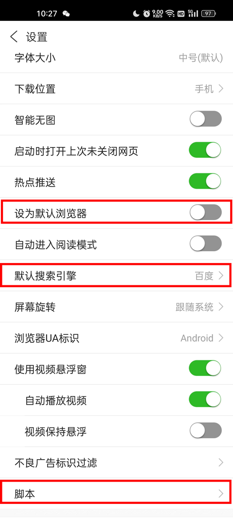4、如果你想把这个浏览器设置为系统的默认浏览器,或是想要更换默认的搜索引擎,再或者需要添加一些自定义脚本,都可以进入设置页面进行相应的操作。