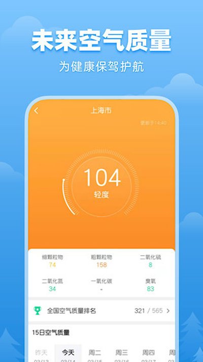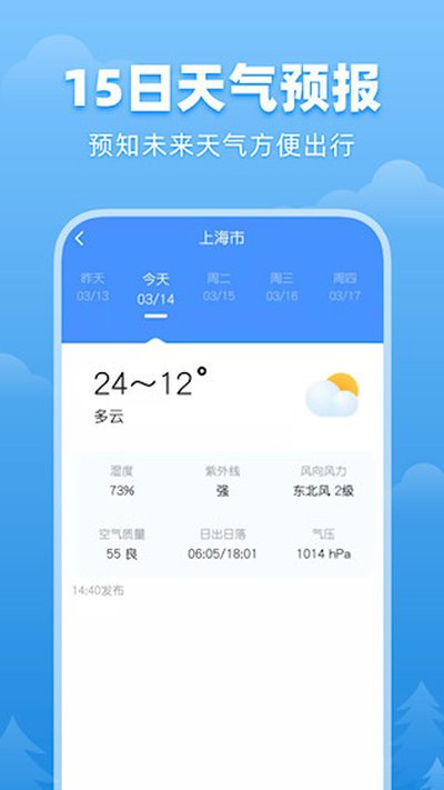 1、未来15天天气预报:提供长达两周的超长天气展望,无论是温度的起伏、晴雨的交替还是风力的变化,都能一目了然。这对于需要提前规划长途旅行、安排重要活动,或是为换季添置衣物的人来说,实在是太方便了,让你对未来的天气状况心中有数。