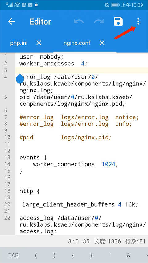 3、在编辑界面里,你可以直接修改配置文件内容并进行保存。如果需要更多操作,可以点击右上角的【三个点】菜单图标,那里提供了新建文件、打开文件、另存为以及查找与替换等丰富的功能。