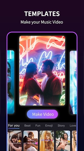 将音乐添加到视频一段没有背景音乐的视频总是显得有些单调,而配上音乐后,整个作品会立刻变得生动活泼起来。你应该尝试在你的视频里加入那些你认为最能表达情感的歌曲,这样才能打造出符合你预期的完美作品。此外,应用里还预设了许多自带酷炫色彩特效的音乐视频模板,你只需要选择几张照片,再点击一下生成按钮,短短几秒钟之内,一个充满动感的音乐视频就新鲜出炉了。