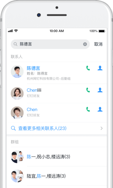 【一体化通讯录管理】企业可以将内部员工和外部合作伙伴的联系方式及组织架构一次性导入,进行集中管理。管理员可以随时随地增删、查找和联系组织内的任何人,真正实现了扁平化的高效管理。