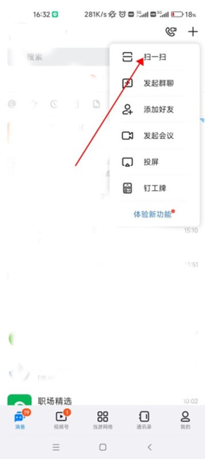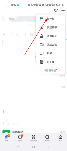 2、接着,点击屏幕右上角的“+”号按钮,在弹出的菜单中选择“扫一扫”功能。
