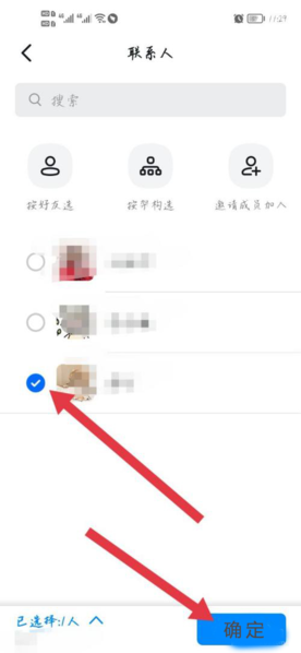 这时页面会跳转到你的联系人列表,勾选你想要邀请的新成员,然后点击右下角的“确定”按钮,邀请就发送出去了。