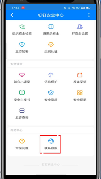5、在安全中心里,找到并点击“联系客服”的选项。