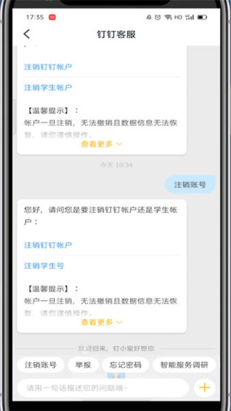 7、最后,根据客服机器人提供的指引,选择你的钉钉号类型并按照提示完成后续步骤,即可成功注销。