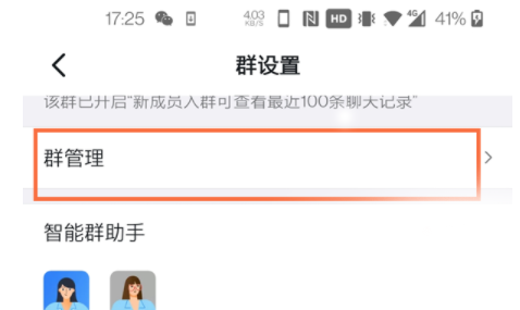 1、先进入你想设置管理员的钉钉群聊界面,点击右上角的三个点图标,在打开的群设置菜单中,选择“群管理”选项。