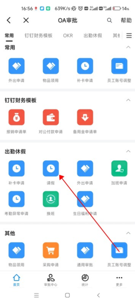 进入工作台页面后,在众多应用中找到“OA审批”并点击进入,接着在“假勤管理”分类下找到并点击“请假”选项。