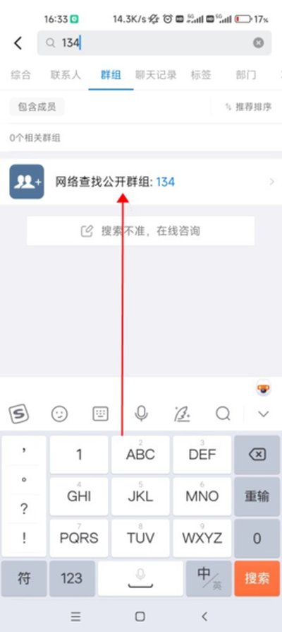 4、还有一个方法是在顶部的搜索框里直接输入你知道的群号码,然后在搜索结果中选择“群组”分类。