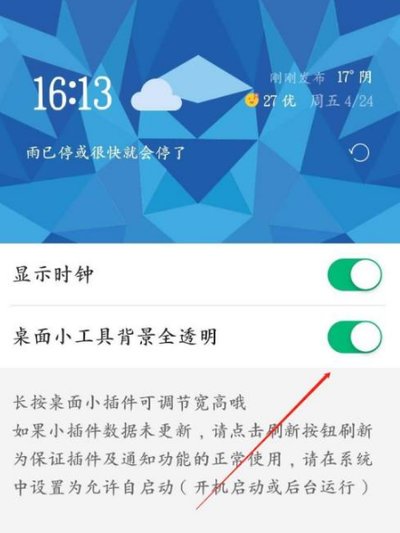系统会自动弹出设置提示,建议将背景和相关的开关都选择开启,这样彩云天气的小部件就能成功显示在桌面上了。