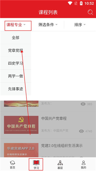 4、切换到“学习”标签页,在“课程列表”中,你可以根据不同的课程专业进行筛选,轻松找到自己感兴趣或者工作需要的学习内容。