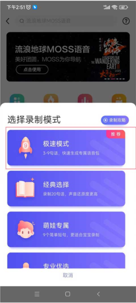 在语音录制界面中,系统提供了极速模式、经典选择、萌娃专属及专业优选等多种选项。从中挑选一个你偏好的模式,即可开始进行录音。。