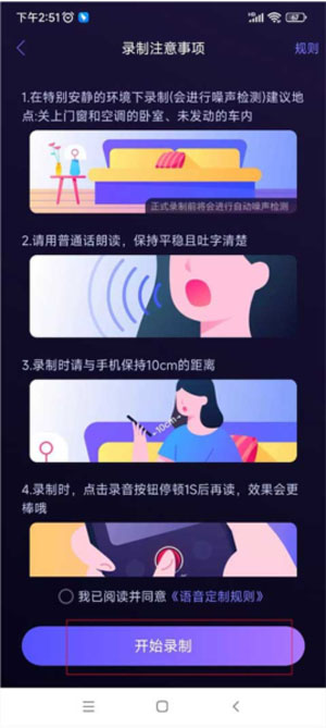 3、这时候,应用会弹出一个提示,告诉你录制时需要注意的事项。关键的一点是,录音时要确保周围环境非常安静。仔细阅读完这些提示后,点击“开始录制”按钮就行了。